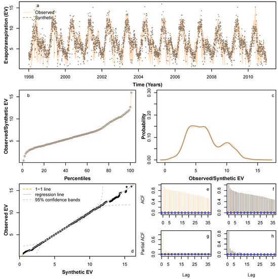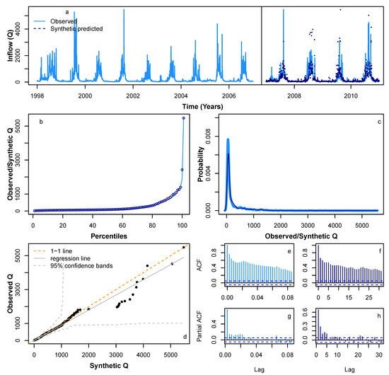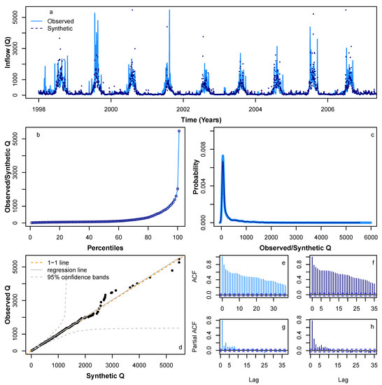 We applied HMM_GP methodology to simulate synthetic sequences for , P and Q. Figure 6 and Figure 7 show a sample synthetic series generated using the HMM_GP methodology for and P, respectively, during the period from 1998 to 2010, and Figure 8 shows a sample synthetic series for inflow (Q) during the period from 1998 to 2006. The synthetic time series exhibits good agreement with periodic peaks and troughs of the observed data (Figure 6a, Figure 7a and Figure 8a), although since our modelling is based on probabilities, the most extreme values in the synthetic series do not always match the years in the original Q time series when the most extreme events occur. Notably, as and Q both have clear annual peaks and troughs, the modelled synthetic data show better agreement with annual timings of highs and lows than for P. The percentiles and probability density function for the synthetic series follow the observed time series reliably (Figure 6b,c, Figure 7b,c and Figure 8b,c) and the quantile–quantile plot in Figure 6d, Figure 7d and Figure 8d show good agreement, particularly below the 99th percentile. Figure 6e,g, Figure 7e,g and Figure 8e,g show the auto-correlation and partial auto-correlation over a lag time of 1 month for the actual data for , P and Q, respectively, with their counterparts for the synthetic series shown in Figure 6f,h, Figure 7f,h and Figure 8f,h. There is a good agreement for each of the synthetic series with actual data, and we also note that both and Q show a higher level of auto-correlation in general (Figure 6e,f and Figure 8e,f) when compared with P (Figure 7e,f).