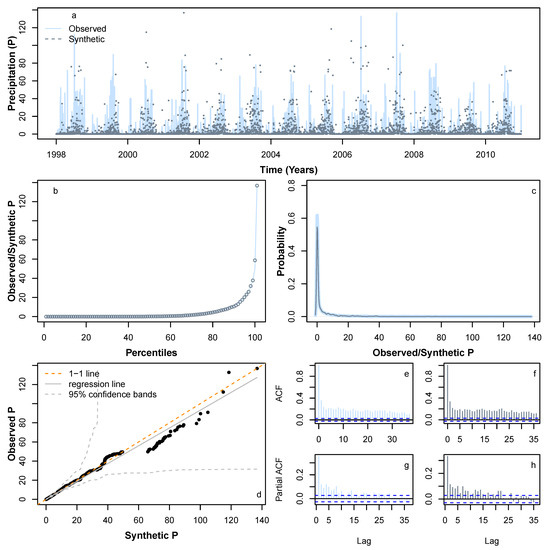 Comparison of various statistical characteristics of a sample synthetic P time series during the period 1998–2010 (dotted lines in slate grey), based on a learning P pattern from 1998 to 2010, with observed P 1998–2010 time series (solid lines in light slate grey). Comparing (a) realisation; (b) percentiles; (c) probability density distribution; (d) QQ-plot; (e) ACF for observed; (f) ACF for a sample synthetic series; (g) PACF for observed; and (h) PACF for a sample synthetic series.