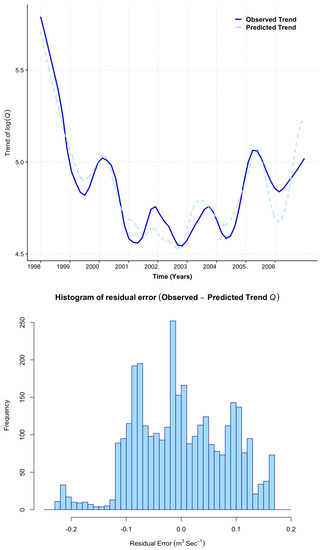The climate module is a novel feature of the HMM_GP model intended to establish a mathematical association between the trend components of climatic variables ( and P) with the trend of (Q) using a simple multiple regression-based models. The key underpinning idea is that such a relationship can be used to project changes in the trend of future Q as a response to change in and P. The seasonal component can be explored with the same conceptual framework, though it is not the focus of the present work. The output from R [65] for the linear model linking the trend of to the trend of and trend of gives the following model summary: