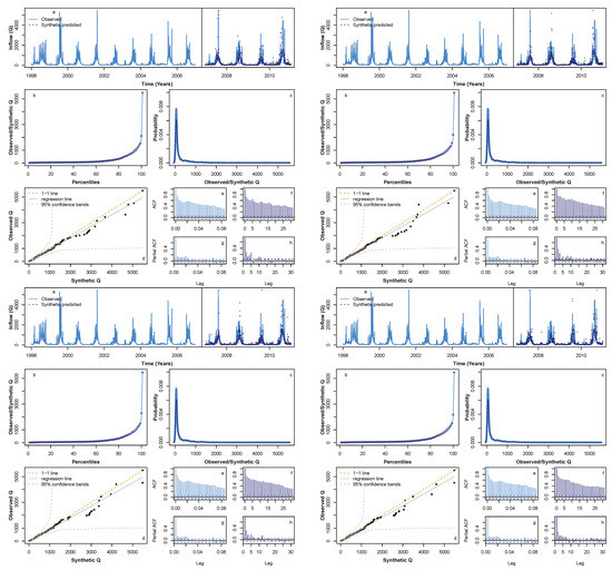 Comparison of four sample synthetic Q time series during the period 1998–2006. This figure is aimed to illustrate the performance of the model for additional four samples and is a cluster of four subfigures that contains 8 subsubfigure each (listed as a–h) for consistency. See Figure 8 for individual figure details.