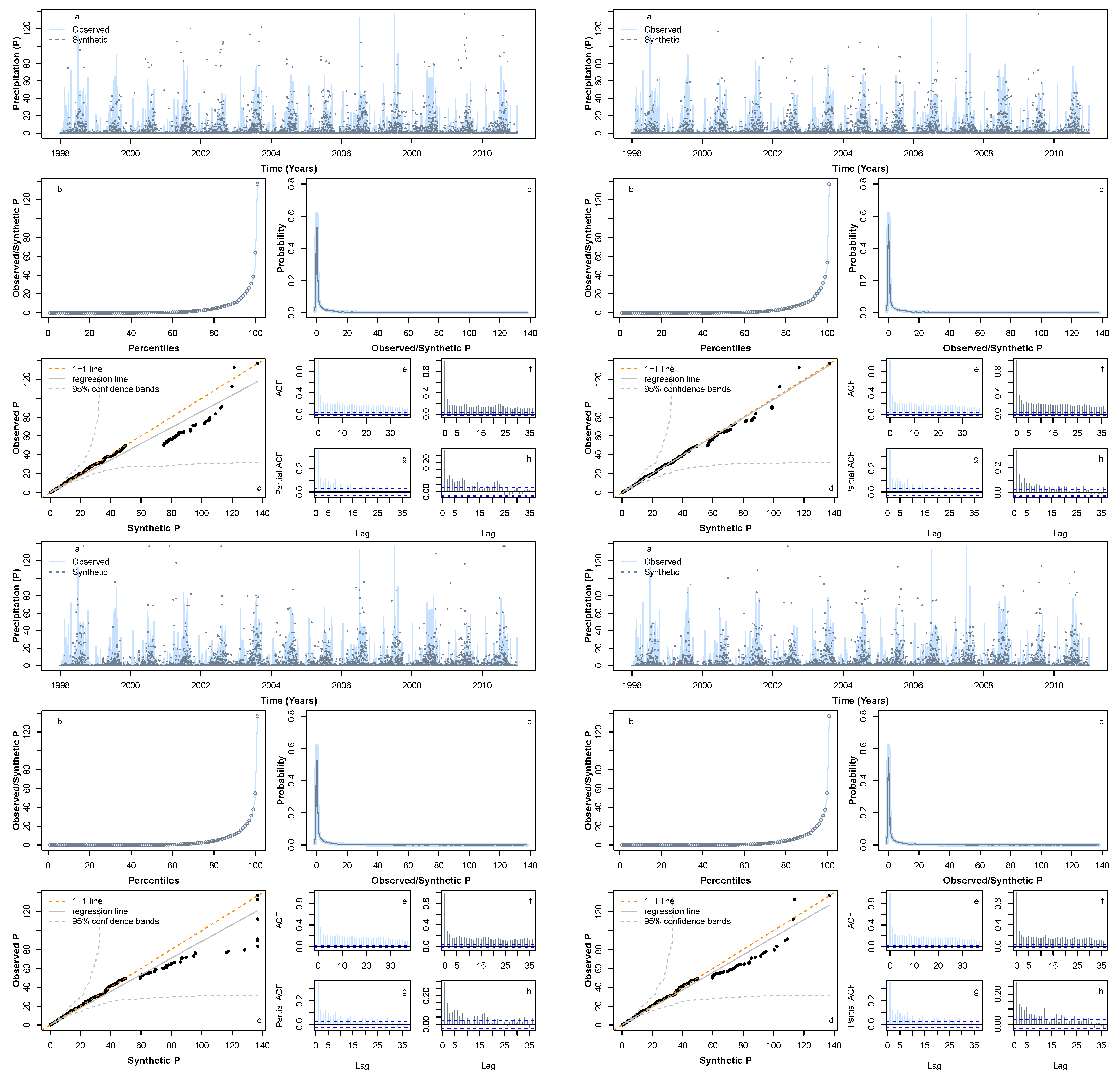 - Time series of P has a wide range of values with many zero values and a long-tailed distribution. For the time series of P, as there can be valid zero elements of the series, we shift the series by a very small translation, 0.001, so that we can take the of the series. As the data are available in two decimal places and range from 0.01 to 136.83, this small value does not represent a significant change to the data and does not excessively stretch (on the negative side) the range of values that the log of the series takes (note this is significant when fitting an HMM to the data). Stages 1 and 2 are applied, and after transforming the synthetics series, we subtract the small shift value, 0.001, from the synthetic series. In contrast to the data, in Stage 3, as the distribution for the P data is very long-tailed, thus, we choose to fit a GP distribution.