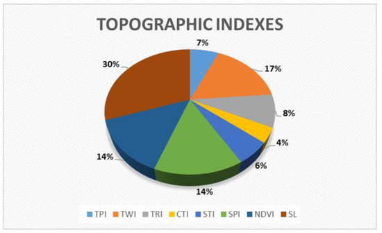 Digital models are also attached with a topographic position index (TPI) [17,18,20,29,30,46,47], topographic wetness index (TWI) [6,7,13,17,20,26,29,30,33,34,35,36,37,41,46,47,48,49,50], topographic roughness index (TRI) [13,17,18,20,21,23,29,30,33,36], compound topographic index (CTI) [21,32,40,51], sediment transport index (STI) [13,17,32,35,36,47], stream power index (SPI) [13,17,20,21,29,30,32,33,34,35,36,37,40,41,50,51], and normalized difference vegetation index (NDVI) [13,21,22,26,28,35,36,38,52,53,54,55,56,57,58]. An unmanned aerial vehicle (UAV) method for vegetation parameters was proposed, as it removes vegetation, offers high-resolution images, and is inexpensive [59]. DEMs with a high-resolution extract detailed information on the topography and, consequently, offer more reliable evaluation of the factors [18].