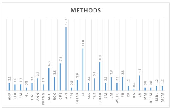 The frequency of the methods used for landslide/rockfall studies is shown in the following diagram and is based on this literature review (Figure 2). According to this diagram, most researchers preferred photogrammetric methods, API, SI, LiDAR, and GPS at a rate from 8% to 18%, which is logical as these offer detailed information on the topography as well as the opportunity to create new DEMs according to the demands of the respective research. The network methods (ANN, TIN, and FBPNN) have been sparingly used at a rate from 1.7% to 3.4%, with the ANN method producing a larger rate. The AUC and ROC models gave rates of 6.5% and 4%, respectively, and via them an evaluation of the credibility of the final maps was possible. The scanning methods, ALS, TLS, and InSAR, were moderately used at a rate of 3%. Additionally, the APH, KM, LM, WofE, FR, and LR methods were of moderate preference and many researchers used more than one in their study, aiming to compare the results and determine which was the most reliable. Of these methods, LR had the highest rate (4%). The rest of the models, PLR, FM, HL, TPI, CF, MM, RFEM, SLBL, and MCM, were used at a rate of less than 1.5%. This small percentage of preference may be due to model restrictions, which lead to implementation difficulties, or these models may be more appropriate for other types of study.