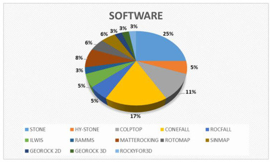 The frequency of the use of different software in landslide/rockfall investigation is shown in the following pie chart and is based on this literature review (Figure 3). According to this pie chart, most researchers preferred, at a rate of 25%, the 3D STONE software. This may be due to the lack of resolution restrictions, while HY-STONE software (which is similar to 3D STONE) was preferred at a rate of 5%. The second most commonly used software was CONEFALL, at a percentage of 17%, and the third was COLPTOP, at 11%, with both types of software offering detailed kinetic information on rockslides. MATTEROCKING was used by 8%, while ROCFALL, ILWIS, ROTOMAP, and SINMAP software were present in the studies but not as frequently as the above (8%). The less used software types were RAMMS, ROCKYFOR3D, and GEOROCK 2D and 3D, which analyze rockfall trajectories and were chosen at a rate of 3%. These three programs are newer than the others and have been gaining momentum in recent years. The low rate (3%) can be explained by this study containing data from a 30+-year period; hence, the older software types have already been used by a higher number of researchers.