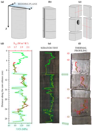 Schemes of (a) the full-diameter sample orientation and position with respect to the bedding plane; (b) the slabbed sample (with the vertical scratch groove) comes apart in three pieces during scratching at the geomechanical lab; (c) pieces of the samples after plug drilling (black hole in the major slab in the center) with the direction and location of optical scanning (red dashed lines) performed in core storage. Example of one and a half clayey-siliceous samples with (d) UCS and thermal conductivity profiles after adjusting for depth; (e) UCS profiles placed on a photo of the flat core surface made before the scratch test (green arrows show the boundaries of the samples); (f) thermal conductivity placed on a photo of the samples disintegrated after the scratch test (red arrows indicate new boundaries between pieces; samples that were too short were not profiled with the optical scanner).