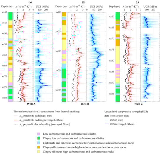 Secondly, rock-forming minerals can be contrasting in one property and non-contrasting in another property. As a result, different rocks may have the same thermal conductivity values at different UCSs or the same UCS values at different thermal conductivities. Unfortunately, reliable information on the UCS of rock constituents is absent, while the published ranges of UCS for common rock types overlap strongly [,]. For example, according to Fjaer et al. [], the UCS varies from 40 to 350 MPa in dolomites and from 2 to 250 MPa in shales. The anisotropy and nonadditivity of UCS and thermal conductivity further complicate joint analysis.