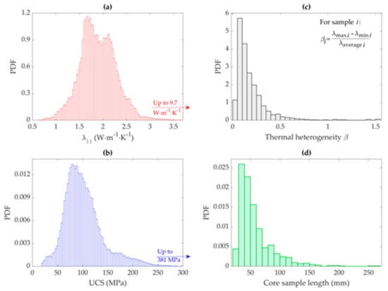 Profiling statistics (Figure 3) show that 99.5% of the thermal conductivity values of the studied rocks lie within the range of 0.75–3.2 W·m−1·K−1, while 99.5% of the UCS values are below 243 MPa. Here, ‘PDF’ represents an estimate of probability density function (the area of each bar is the relative number of observations, the sum of the bar areas is 1), where the number of bins was chosen according to Scott’s rule []. The value of the thermal inhomogeneity coefficient β in 99 cases out of 100 lies in the range of 0.03–0.87, the average value X is 0.18 (standard deviation = 0.13), and the average length of the samples studied by the optical scanning method is 57 mm (standard deviation = 29 mm). The thermal heterogeneity factor was determined for the thermal conductivity profile of each core sample by the formula in Figure 3c, where λmini and λmaxi are the minimum and maximum thermal conductivities recorded along the thermal conductivity profile within the i-th core sample and λaveragei is the average thermal conductivity lengthwise of the core sample []. The average value of the anisotropy coefficient of the studied samples is 1.43, with a standard deviation of 0.30.
