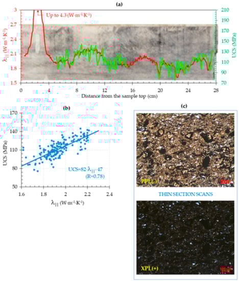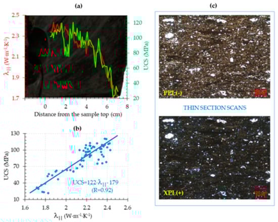 (a) Thermal conductivity and UCS profiles placed on a photo of clayey-carbonate-siliceous high carbonaceous rock (sample #35 from the depth xx23.32 m, well B); (b) results of regression analysis; (c) thin-section scans under plane-polarized light (PPL) and crossed polars (XPL).