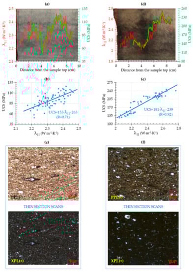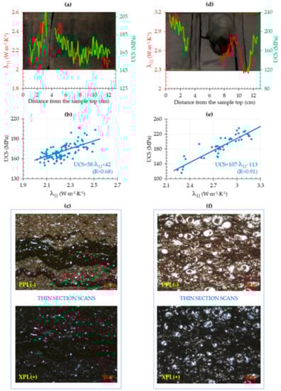 Local discrepancies between the UCS and thermal conductivity profiles of individual samples (Figure 3, Figure 4, Figure 5, Figure 6, Figure 7 and Figure 8) can also be explained by the following factors: