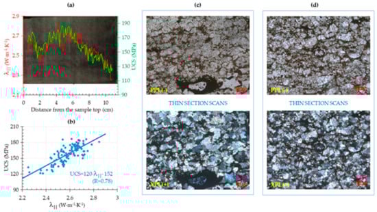 (a) Thermal conductivity and UCS profiles placed on a photo showing the alternation of clayey-carbonate-siliceous carbonaceous and siliceous-carbonate high carbonaceous rocks (sample #796 from the depth xx73.35 m, well A); (b) results of the regression analysis; thin-section scans for (c) clayey-carbonate-siliceous carbonaceous and (d) siliceous-carbonate high carbonaceous sections of the sample.