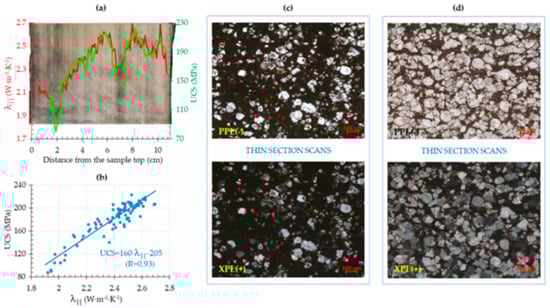 (a) Thermal conductivity and UCS profiles placed on a photo of interval of alternation of siliceous-carbonate and clayey-siliceous-carbonate rocks (sample #118 from the depth xx34.27 m, well B); (b) results of regression analysis; thin-section scans under plane-polarized light (PPL) and crossed polars (XPL) for (c) siliceous-carbonate sections and (d) clayey-siliceous-carbonate sections of the sample.