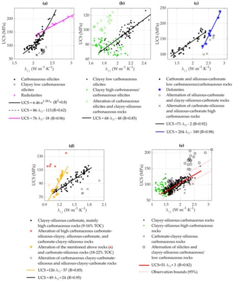 Relationship between unconfined compressive strength and thermal conductivity for different lithophysical types (the type described in Table 1 and Figure 2): (a) low carbonaceous/carbonaceous silicites, (b) clayey low carbonaceous/carbonaceous silicites, (c) carbonate and siliceous-carbonate low carbonaceous/carbonaceous rocks, (d) clayey-siliceous-carbonate high carbonaceous rocks, (e) clayey-siliceous high carbonaceous/carbonaceous rocks. See text for details.