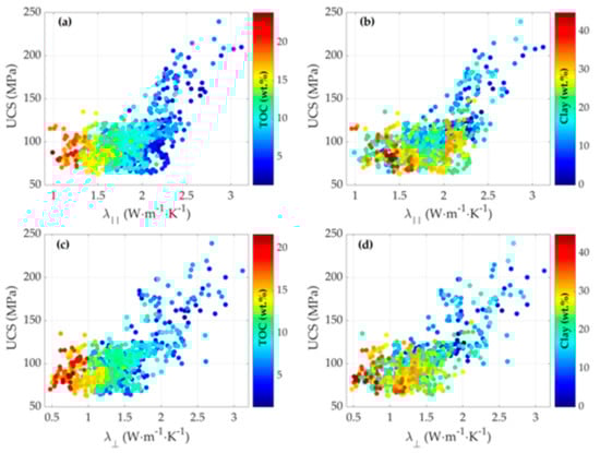 According to Zoback and Kohli [], both organic matter and clay in the rock matrix significantly impact the mechanical (and flow) properties. In our case, the UCS generally decreased with an increasing clay plus TOC content, which is in agreement with published reports on rock behavior []. Distinguishing the independent effects of clay and kerogen on physical properties (particularly UCS) is very difficult. At the same time, thermal conductivity is more sensitive to a change in the content of organic matter than to a change in the content of clays (this follows from the comparison of the crossplot coloring in Figure 11a,b or Figure 11c,d). This feature can be used to distinguish the independent effects of clay and kerogen.