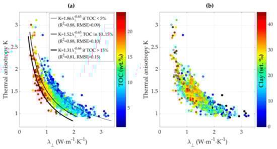 The comparison plots in Figure 12a,b show that the relationships between the thermal anisotropy coefficient and thermal conductivity perpendicular to the bedding are individual for different TOC ranges. This cannot be explained by a variation in the content of clay minerals, but it can be explained by the features of the spatial distribution of organic matter. Kerogen accumulations are distributed in the rock matrix (of the studied deposits of the Bazhenov Formation) either uniformly or in the form of spots and layered-plane horizontal-lenticular fibers []. Other possible reasons for this behavior are a variation in porosity or a relatively high degree of spatial heterogeneity in the void space of the Bazhenov Formation [] (see Section 4.2).