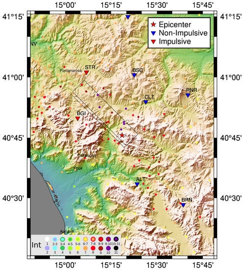 Spatial distribution of impulsive (red triangle) and non-impulsive (blue triangle) signals determined by the algorithm of Shahi and Baker [51] for 23 November 1980 (18:34) Irpinia earthquake ( = 6.9). Rupture surface is retrieved from Ameri et al. [73] and macroseismic intensity (Int) measurements are taken from Rovida et al. [65]. Red star indicates the epicenter of the event.