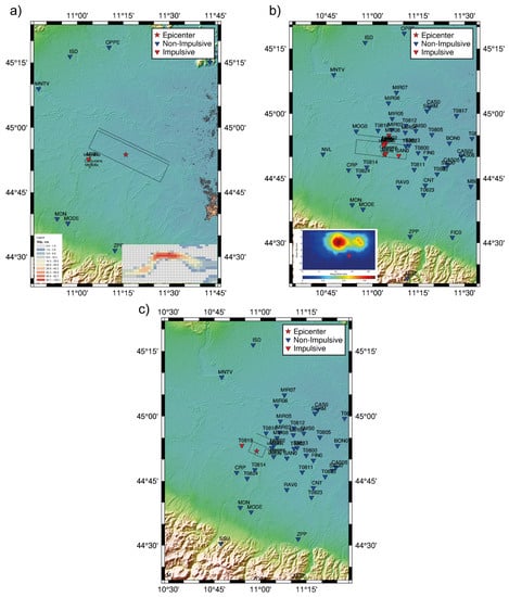 Spatial distribution of impulsive (red triangle) and non-impulsive (blue triangle) signals determined by the algorithm of Ertuncay and Costa [53] for Emilia-Romagna earthquakes of (a) 20 May 2012 ( = 6.1), (b) 29 May 2012 (07:00) ( = 6.0), and (c) 29 May 2012 (10:55) ( = 5.5). Rupture surface of earthquakes are retrieved from Pezzo et al. [80], Paolucci et al. [81], Kaklamanos et al. [82], respectively. Slip distribution of 20 May 2012 is modified from Figure S7 of Electronic Supplement of Pezzo et al. [80]. Slip distribution of the 29 May 2012 (07:00) Emilia-Romagna earthquake modeled by Paolucci et al. [81] and can be seen in Figure 8 of the mentioned study. Red star indicates the epicenter of each event.