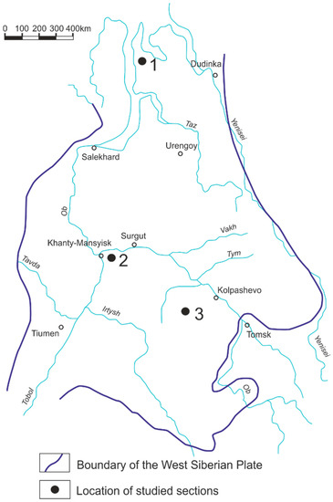 Location of the studied sections (1—northern; 2—central; 3—southern) on the schematic map of the West Siberian Plate.