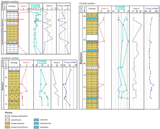 Group II includes points with δ13C values less than −15‰VPDB and δ18O values above −5‰VPDB. According to [7,47], this group corresponds to sedimentary-diagenetic methane-derived limestones. These carbonates are formed on the seabed in the areas of focused methane discharge, when methane reaching the seafloor surface is oxidized by microorganisms under anaerobic conditions. Due to bacterial reworking of the isotopically light methane, the carbon dioxide and carbonates which are formed with participation of this carbon dioxide are considerably depleted in 13C [47,48,49,50,51,52]. Since the process generally occurs in the upper part of marine sediments, δ18O of methane-derived carbonates is close to normal marine biogenic ones. Among the samples studied in this work, only one sample with the highest carbonate carbon content from the upper part of the Bazhenov Formation of the northern section (δ13C −26‰VPDB) can be attributed to carbonates of this type (group II). In the studied collection there are several samples, which have isotope composition close to group II carbonates, including one sample from the northern section (δ13C −12.9‰VPDB) and three samples from the central section (δ13C from −15.8 to −13.8 ‰VPDB). The low δ13C values indicate the high amount of 13C-depleted CO2, which could be also formed during the OM transformation in catagenesis.