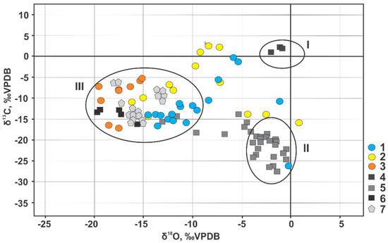 Group I shown in the diagram includes points with values of 0 ± 4‰VPDB for both δ13C and δ18O, corresponding to primary biogenic limestones or shell remains [47], which is also consistent with the data reported in [18,19,20,21]. Not a single sample from the studied sections fell into Group I.