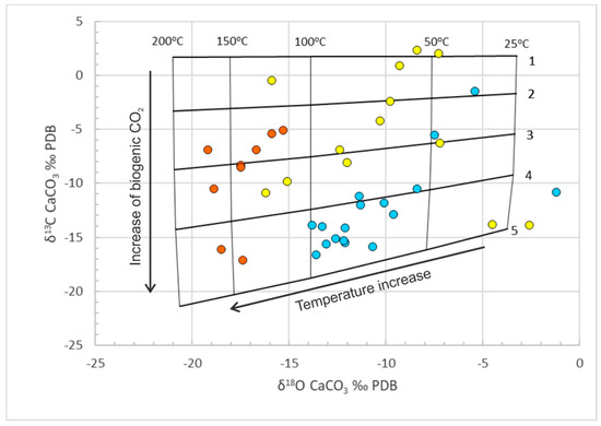Oxygen and carbon isotope composition of carbonates from the studied sections (northern—blue; central—yellow; southern—orange circles). Lines indicate the equilibrium values of the carbon and oxygen isotope composition of calcite in the rocks containing calcite (0.05 mol/kg of rock), water (5.6 mol/kg of rock) and CO2 (1—0.00048 mol/kg of rock; 2—0.0096 mol/kg of rock; 3—0.024 mol/kg of rock; 4—0.048 mol/kg of rock; 5—0.12 mol/kg of rock) in the temperature range from 25 to 200 °C. Initial values of δ13C and δ18O: δ13CCO2 = −31‰VPDB; δ18Owater = −1‰VSMOW; δ13Ccalcite = +2‰VPDB and δ18Ocalcite = −0.1‰VPDB.