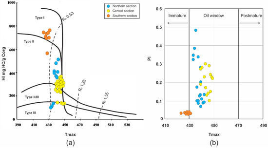 The location of points corresponding to the samples from the southern section in the diagram shown in Figure 4 indicates significant concentrations of biogenic carbon dioxide in fluids and an elevated temperature of carbonates deposition from 110 to 165 °C. However, the conclusion about elevated temperatures does not agree with the results of pyrolysis data. According to Rock-Eval analysis, the samples are characterized by the values of Tmax (423–429 °C) corresponding to immature kerogen (Table 1) and by the highest values of the hydrogen index (HI), which is clearly visible in the modified Van Krevelen diagram (Figure 5a) and plot showing PI versus Tmax after [65] (Figure 5b). Pyrolytic data indicate that, in contrast to the carbonate isotope data, the formation temperatures of the rocks from the southern section were lower than in the central and northern regions.