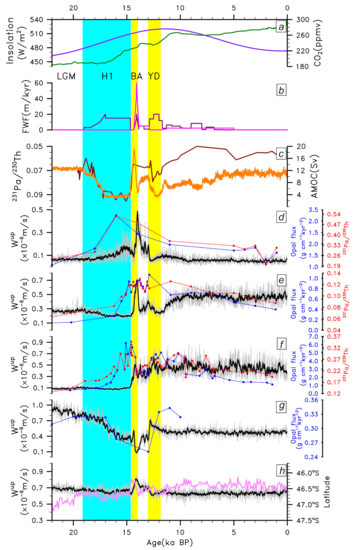 Paleo-proxy reconstructions have shown dramatic changes in the Southern Ocean upwelling during the last deglaciation, which potentially contribute to the deglacial rise of atmospheric CO2 [1,2,3,4,5]. The “westerlies shift” hypothesis is one of the mostly discussed mechanisms on the changes in Southern Ocean upwelling. According to this hypothesis, an equatorward shift of the Southern Hemisphere westerlies acts to weaken the Southern Ocean upwelling during glacial periods such that more respired CO2 accumulates in deep oceans while the atmospheric CO2 concentration reduces [6,7,8]. During interglacial periods, a poleward displacement of the the Southern Hemisphere westerlies intensifies the Southern Ocean upwelling and respired CO2 outgassing [1,9,10], thus leading to an increase in CO2 in the atmosphere. Such glacial–interglacial swings of the Southern Hemisphere westerlies and Southern Ocean upwelling could be coupled to atmospheric CO2 variations and be related to the global mean climate, the bipolar seesaw and Earth’s obliquity [5].