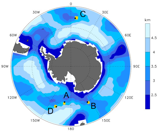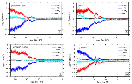 where the Ekman pumping , is the surface wind stress, and where the integration is from an arbitrary depth z that is away from ocean bottom to the bottom of the Ekman layer. Here, is related to a local topographic steering [45]. Based on Equation (8), the vertical velocity, and in turn, the local upwelling, are expected to be different downstream (upstream) of a submarine ridge where a strong southward (northward) flow exists. During the LGM, cores A, B and C were located downstream of the Macquarie Ridge, the Kerguelen Plateau, and the American-Antarctic Ridge, respectively (Figure 2), where a prevailing southward flow (Figure 6a–c) was accompanied by a vertical stretching that increased with depth. As a result, the upward velocity was reduced from the base of the Ekman layer with depth, and may have vanished or even been reversed to downwelling at certain depths. In contrast, core D was located in the upstream of the Macquarie Ridge (Figure 2), so the prevailing northward flow there (Figure 6d) was accompanied by a compression of the water column, which enhanced the upwelling from the Ekman layer toward deeper levels. Clearly, meridional vorticity advection controls the vertical extension of upwelled flows below the Ekman layer and therefore, regulates the variation of local upwelling.
