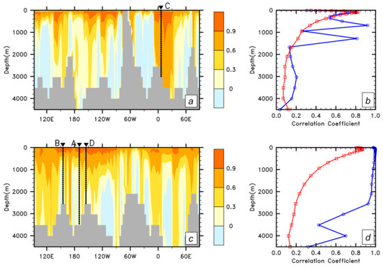 Depth–longitude diagrams of local correlation between the Ekman pumping and local vertical velocity (a) outside the open channel region, along 52.9 S and (c) within the open channel region, along the average section between 60.9 S and 57.1 S. Locations of the proxy cores A–D are marked. Vertical profiles of the correlation between zonal mean Ekman pumping and zonal mean vertical velocity (blue) and the zonal average of the correlation between local Ekman pumping and local vertical velocity (red) along the latitude of (b) 52.9 S and (d) the average section between 60.9 S and 57.1 S.