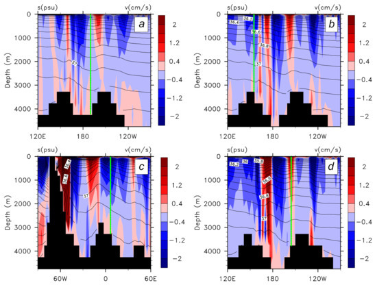 Zonal sections of salinity (contour in psu) and meridional velocity (shading in m/s) along (a) 60.9 S, (b) 59.0 S, (c) 52.9 S and (d) 57.1 S at 22 ka BP. The locations of the four proxy cores are marked (green) on the zonal sections, respectively.