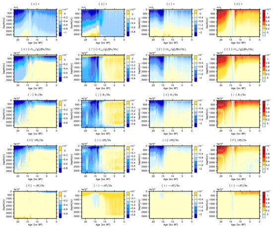 Depth-time diagrams for cores A–D during the last 22,000 years: (a–d) the meridional velocity v (shading in ), (e–h) the vertical shear of v which is scaled for zonal density gradient via the thermal wind relationship: (shading in ), (i–l) the zonal density gradient (shading in ), (m–p) the haline contribution to zonal density gradient : (shading in ) and (q–t) the thermal contribution to zonal density gradient : (shading in ).