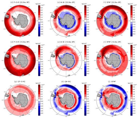 We find that, during the last deglaciation, changes in surface freshwater fluxes over the Southern Ocean were essentially contributed by those in sea ice melt and brine rejection (Figure 9). From the LGM to early Holocene, surface ocean temperature around Antarctica significantly increased due to a bipolar see-saw response [52] to meltwater discharge into the North Atlantic [53] during Heinrich event 1 and the Younger Dryas as well as a CO2 warming [54]. Accordingly, less Antarctic sea ice was formed in austral winter such that brine rejection was also reduced, which led to an anomalous freshwater input around Antarctica to dilute Antarctic Bottom Water (AABW). During the last deglaciation, the dilution of AABW was even stronger than that of North Atlantic Deep Water (NADW), which is indicated from the proxy records [55,56]. Therefore, the meridional salinity gradient across the Circumpolar Deep Water (CDW), as exampled by the salinity contrast between AABW and the southward outflow of NADW through the South Atlantic sector, was reduced (Figure 10).