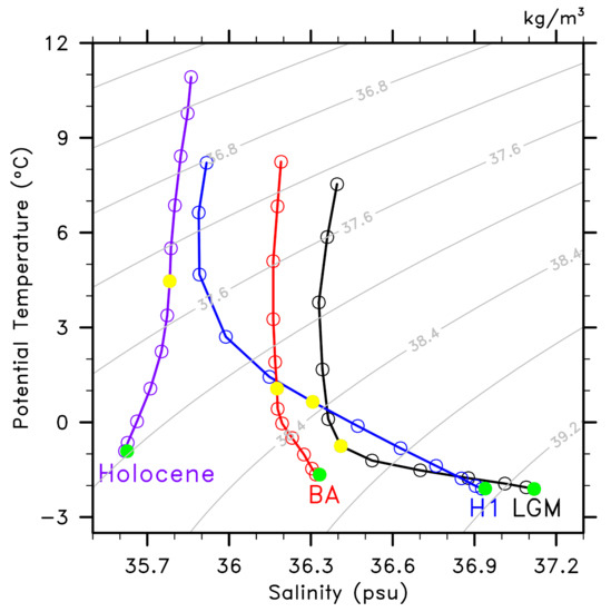 Atlantic basin-average T-S profiles (with depth) during the LGM (22 ka BP, black), H1 (17 ka BP, blue), BA (14.2 ka BP, red) and early Holocene (10 ka BP, purple). NADW is denoted at 1475 m (solid yellow dots) while AABW is denoted at 4751 m (solid green dots). For each profile, only the part below 326 m is shown. Contours of constant potential density are shown in gray.