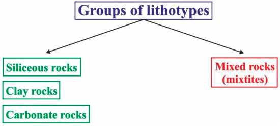 Based on the study of the mineral composition, structure, and texture of the rocks of the Bazhenov formation, two main groups of lithotypes were identified using a set of methods (Figure 1) [16]: