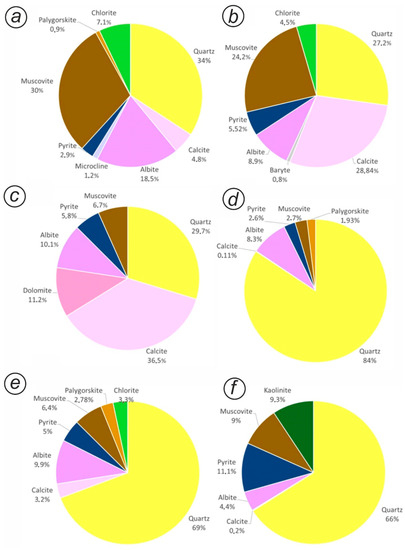 Variations in the mineral composition of mixtites (top) and silicites (bottom) based on the results of diffractometric analysis. Samples: Novogodnyaya well (a), Yuzhnaya well (b), Yuzhno-Priobskaya well (c,d), Yuzhno-Kinyaminskaya well (e), Orehovo-Ermakovskaya (f).
