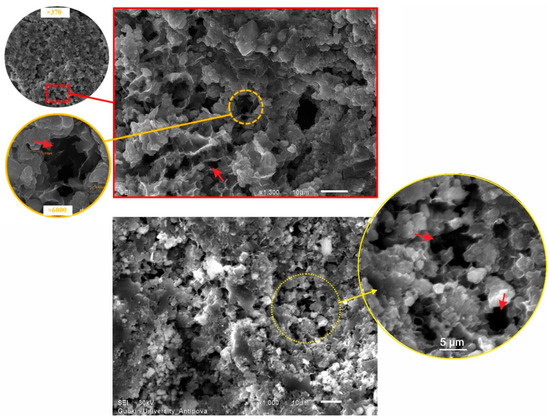 Interform and intraform voids were observed in the carbonate layers of the Bazhenov formation. Their size ranged from a few microns to 10–20 microns, and in some samples ranged from 400 to 500 microns. They were confined to the shells of pelecypods, radiolarians, and coccolithophorids (Figure 6). Moreover, in these rocks there were leaching voids, the size of which varied from a few micrometers to 70–100 microns.