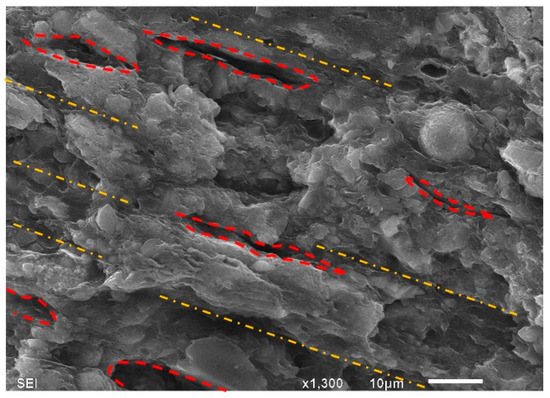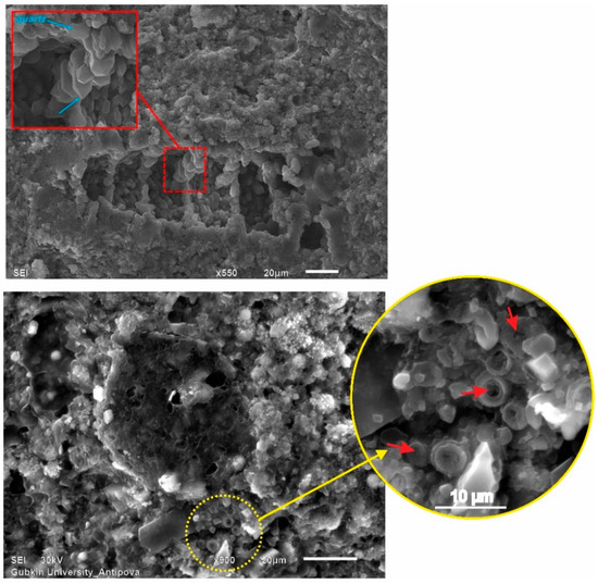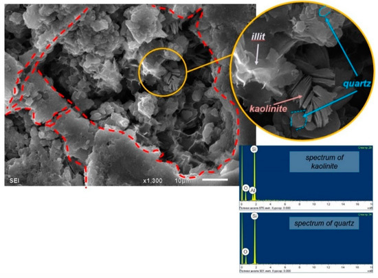 In the middle part of the Bazhenov formation section, large voids of 50–100 microns were present in clay–kerogen silicites (Figure 5). On the surface of the walls of such voids, newly formed quartz crystals with a size of up to 5 microns, as well as flakes of kaolinite and illite with a size of 3–5 microns, were noted. These voids were often filled with organic matter, which was largely removed by chloroform extraction, which indicates its mobility.