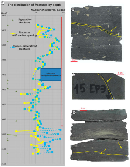 In the deposits of the Bazhenov formation, a large number of fractures of various types, spatial orientation, and prevalence have been found (Figure 7). The fractures are of tectonic, lithogenetic, and technogenic origin. Open and mineralized fractures are distinguished.