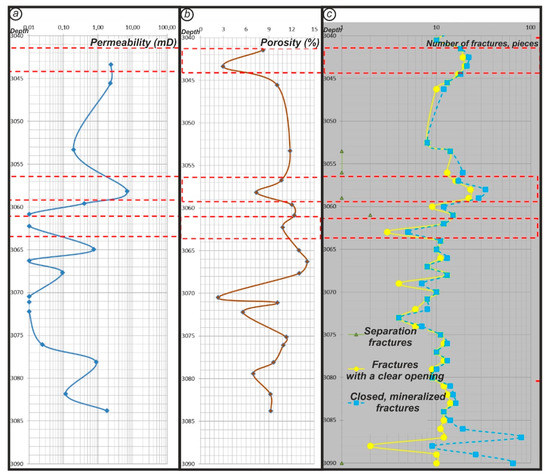 Extended large fractures can connect oil-saturated areas with different types of porosity into a single hydrodynamic space. The analysis of the fracturing distribution over the Bazhenov formation section and the permeability values shows a fairly strong correlation in some cases (Figure 8).