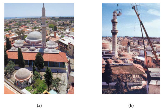 Suleiman Mosque, located in the medieval city of Rhodes (Figure 1), was built in the 16th century by Sultan Suleiman the Magnificent, just after the conquest of Rhodes in 1522 (Figure 2a). It is said that the sultan built the monument in 1522 to celebrate the victory of the Turkish over the Knights. The present study’s subject is mainly the minaret of the Suleiman Mosque and not the whole structure. The 26 m tall minaret with its two balconies stands at the northwest side of the monument’s central hall. Many natural disasters, the most important of which are earthquakes and an explosion underneath the bell tower of a nearby church, damaged the monument. In the early 1980s, the minaret started declining. For this reason, rebuilding of the minaret was unavoidable (Figure 2b) due to the advanced decay of its sandstone blocks. In 1988, the minaret was dismantled and then rebuilt in 2005. The masonry of the new structure was built from fine quality local limestone (more robust than the former masonry stone blocks) and lime mortar with 10% concrete content, reproducing the original sculptured moldings and reinforced with horizontal metal hoops, vertical titanium pins, and lead poured between each course of the masonry [45].