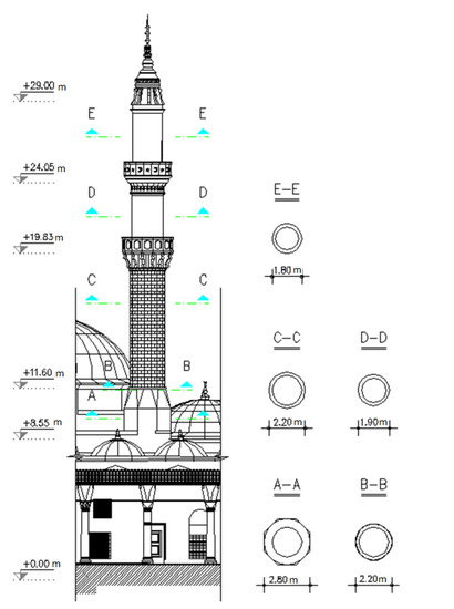 The mosque is made of load-bearing masonry. The mosque’s plan view is symmetrical in the NW–SE axis and includes three square spaces in a row. The central space, 8.00 × 8.00 m, is the largest one, while the other two have a plan view of approximately 5.00 × 5.00 m. The three spaces are lined so that the northwest side, which is also the façade, is about 22.00 m. The masonry, internal and external, is about 1.00 m thick. All three areas are vaulted. The central space has a total height of approximately 15.00 m, while the other two spaces have a height of about 10.00 m. The information regarding the structural geometry of the mosque was provided by Dellas et al. [46]. The typical external configuration of a minaret in height includes the following parts (Figure 3):