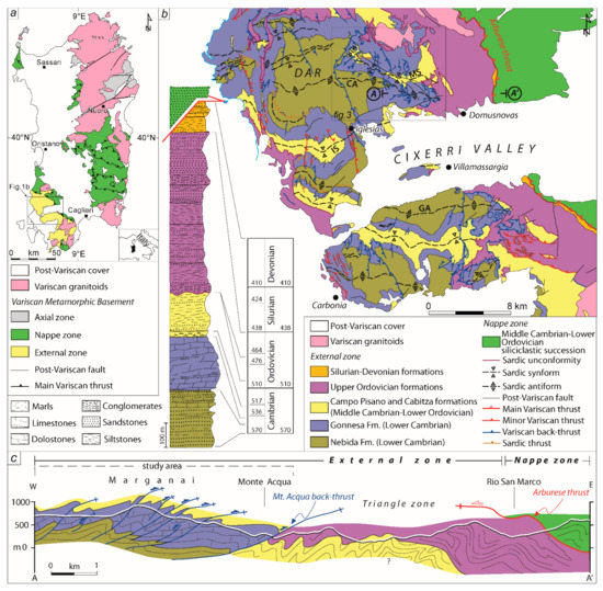 The Paleozoic basement of Sardinia is an almost complete segment of the Variscan chain where the axial, nappe, and external zones of the orogenic belt are well exposed (Figure 1a). The structure of the Variscan chain in Sardinia resulted from a N–S shortening (in present-day coordinates) related to the continental collision that occurred in early Carboniferous times [69]. The nappes were emplaced at first with a top-to-the-S transport direction and later with a top-to-the-W [70]. The W-directed tectonics gave rise to the emplacement of the nappe zone over the external zone [63]. The Arburese thrust (Figure 1b,c) that separates the nappe zone and the underlying external zone is the main Variscan structure cropping out in SW Sardinia. It strikes NW–SE, dipping to NE, for more than 60 km and is marked by a 50 m thick shear zone [63,71].