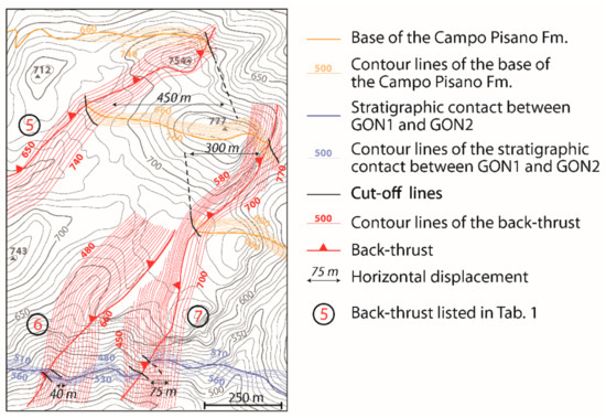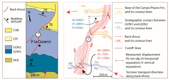 The footwall and hanging wall cutoff lines of the significative stratigraphic contacts have been reconstructed. Note that they are often curved lines since the faults cut folded surfaces; moreover, the same contact could produce not parallel cutoff lines in the footwall and in the hanging wall since the fault can cut the same fold in different part (i.e., limb or hinge) (Figure 2). The cutoff lines have been employed to calculate the displacement; given that sometimes they are not parallel, an average distance was take into account and the results have been approximated to decameters. The horizontal (H), vertical (V), and net (N) displacement along the back-thrusts has been calculated following these steps: (1) H was measured parallel to the transport direction between the cutoff lines of the same stratigraphic contact in the hanging wall and footwall; (2) the steepness of the back-thrust was calculated parallel to the transport direction; (3) V and N were calculated using the values obtained from (1) and (2) by means of trigonometric functions. Note that H and V coincide to heave and throw only in the case the transport direction is parallel to the dip direction of the back-thrust.