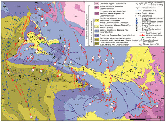 - Carosi, R.; Musumeci, G.; Pertusati, P.C.; Carmignani, L. The Hercynian backthrusts of eastern Iglesiente (SW Sardinia): An example of inversion tectonics. In Contributions to the Geology of Italy with Special Regard the Paleozoic Basement; Carmignani, L., Sassi, F.P., Eds.; No. 276, Newsletter; IGCP: Siena, Italy, 1992; pp. 97–105. [Google Scholar]