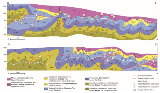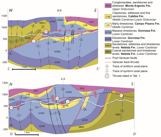 The steepness changes along the same back-thrust according to a ramp-and-flat geometry, where the layer’s competence decreases up-section. The back-thrust’s dip changes from 40° to 45° within the sandstones of the Nebida Fm. and the limestones and dolostones of the Gonnesa Fm. (1C and 1D) to 13° where the lower Cambrian succession is thrusted over the conglomerates, phyllites, and shales of the Monte Argentu Fm. near the Arenas mine (1A). Similarly, the Mt. Acqua back-thrust (29) is steep at 15° where it thrusts the limestones of the Gonnesa Fm. over the Upper Ordovician succession (Figure 4, Figure 6).