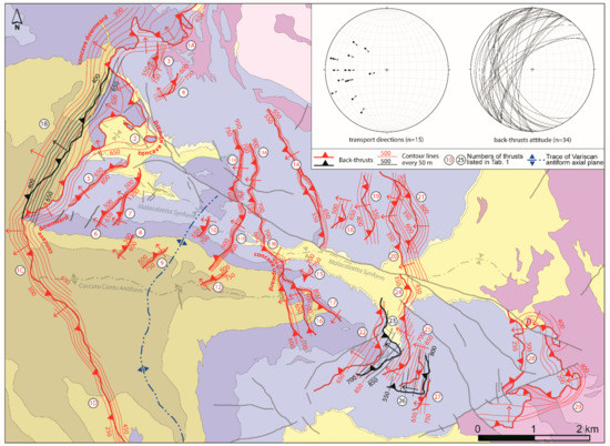 Structural contour lines of the back-thrusts in the study area (in light color the geological map of Figure 3). The different color for back-thrusts is just to avoid confusion between the superposed contour lines. The reported contour lines with a 50 m interval were derived from contour lines with 10 m interval (see example in Figure 2). The upward and downward concave shape of some back-thrusts is highlighted, understood as a change in dip along their general strike direction. The axial surface trace of the N-trending antiform separates a western domain with W-plunging and an eastern domain with E-plunging Sardic folds. Inset equal-area, lower hemisphere stereographic projection of the transport directions and attitude of back-thrusts.