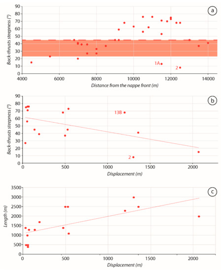 (a) Diagram showing the variation in the steepness of the back-thrust according to the distance from the nappe front (n = 34). The red band indicates the mean steepness of the fore-thrust according to [6]. The red dashed line indicates the mean steepness value of back-thrusts from this study; (b) diagram showing the relationship between the steepness and the displacement of the back-thrust (n = 16); (c) diagram showing the relationship between the length and the displacement of the back-thrust (n = 16).