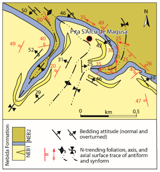 The Variscan S1 cleavage is also folded in the footwall of the Mt. Acqua back-thrust (Figure 3) and, further E-ward, beneath the Arburese thrust [63]. In this case, the development of the folds induced by back-thrusting seems strictly related to the weakness of the stratigraphic succession involved, in this area mainly made up of low-competency shales, favoring a ductile deformation response to the shortening.