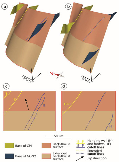 The 3D restoration of back-thrust 7. (a) Deformed state; (b) restored state. (c,d) are the Allan diagram of the deformed and restored states, respectively. The fault surfaces and the cutoff lines are extended just to show the final step of the restoration. Note that after the restoration of the reverse displacement of the base of CPI the amount of normal offset of the base of GON2 increases. Analysis performed with Move Suite by Petroleum Experts (Petex) Ltd. (Academic license).