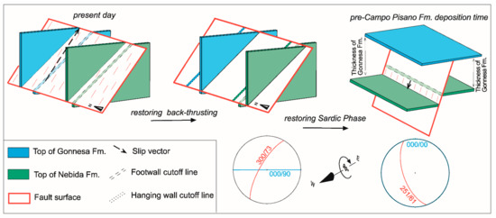 Scheme highlighting that after restoration of reverse displacement affecting the contact between Campo Pisano and Gonnesa fms (blue surface), a normal displacement between Gonnesa and Nebida fms (green surface) should be admitted. Stereographic projections (equal area, lower hemisphere) are related to thrust (in red) and bedding (in blue) in the present-day attitude (on the left) and after the restoration of the Sardic phase through the rotation around a horizontal axis trending E-W.