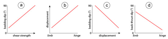Diagrams showing the relationships between (a) bedding dip and shear strength; (b) displacement and folds sectors; (c) bedding dip and displacement; (d) back-thrusts dip and folds sector. Generalized trends are inferred from the system Malacalzetta Synform-Arenas back-thrust.